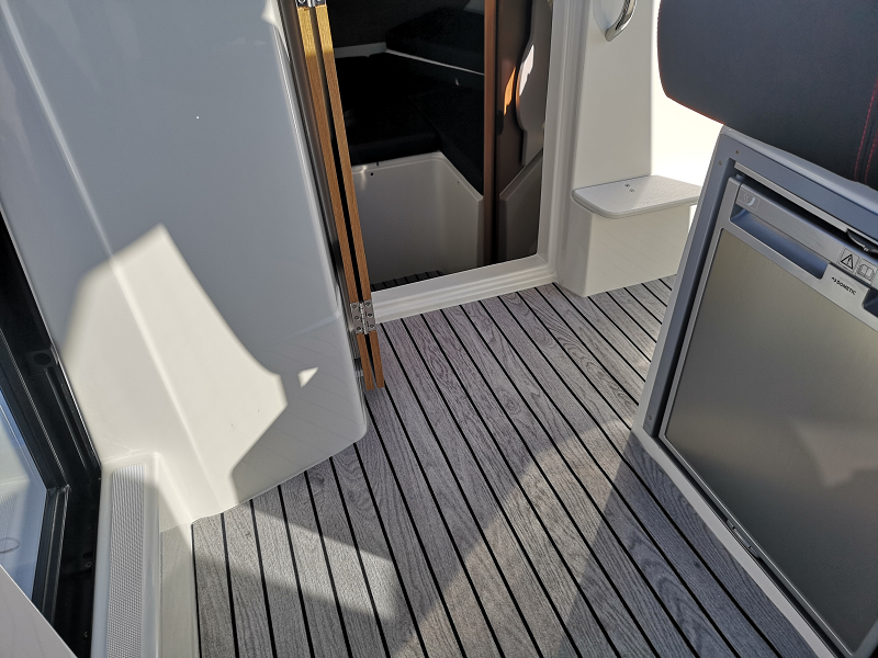 Composite Carpet – a cross between carpet and vinyl with benefits of both. Vinyl backing with short nylon hairs that stand up vertically like a hairbrush. Easy to clean and very stain resistant. Very realistic looking alternative to teak decking in enclosed cockpits. Does not require binding. Can be poppered with reinforcing. 2m width